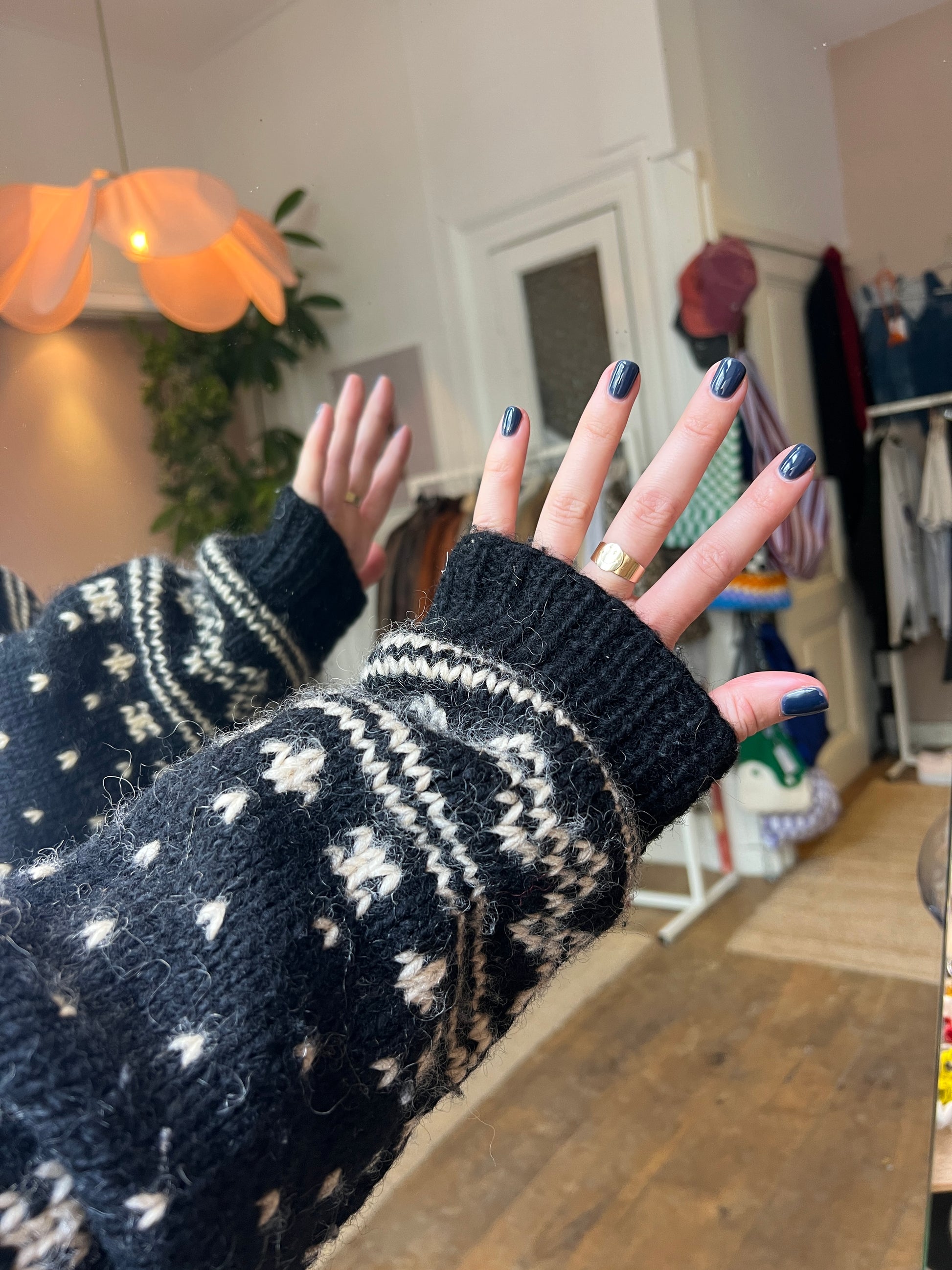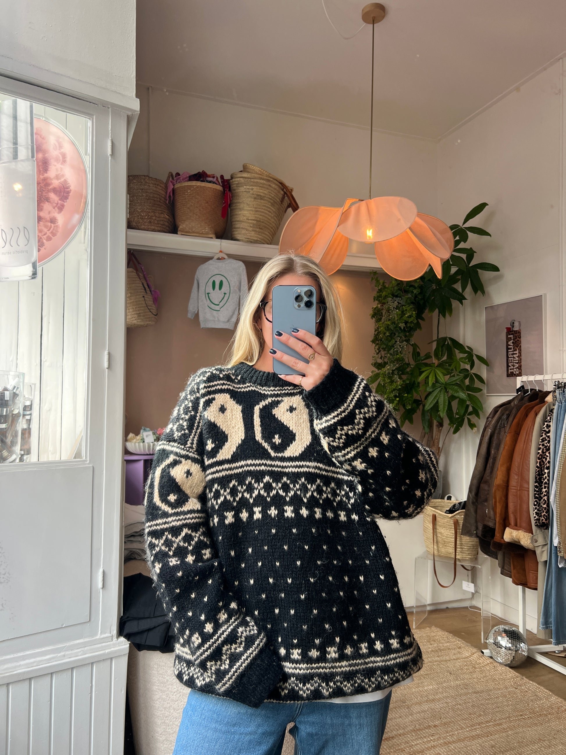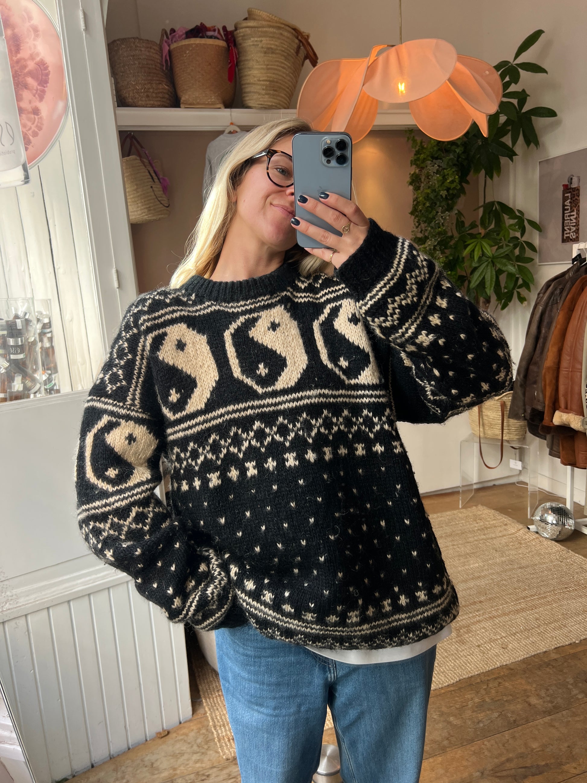 Yin yang wollen trui - handmade - 100% wollen trui - maat XL - Kirsten is 174 en draagt normaal maat M