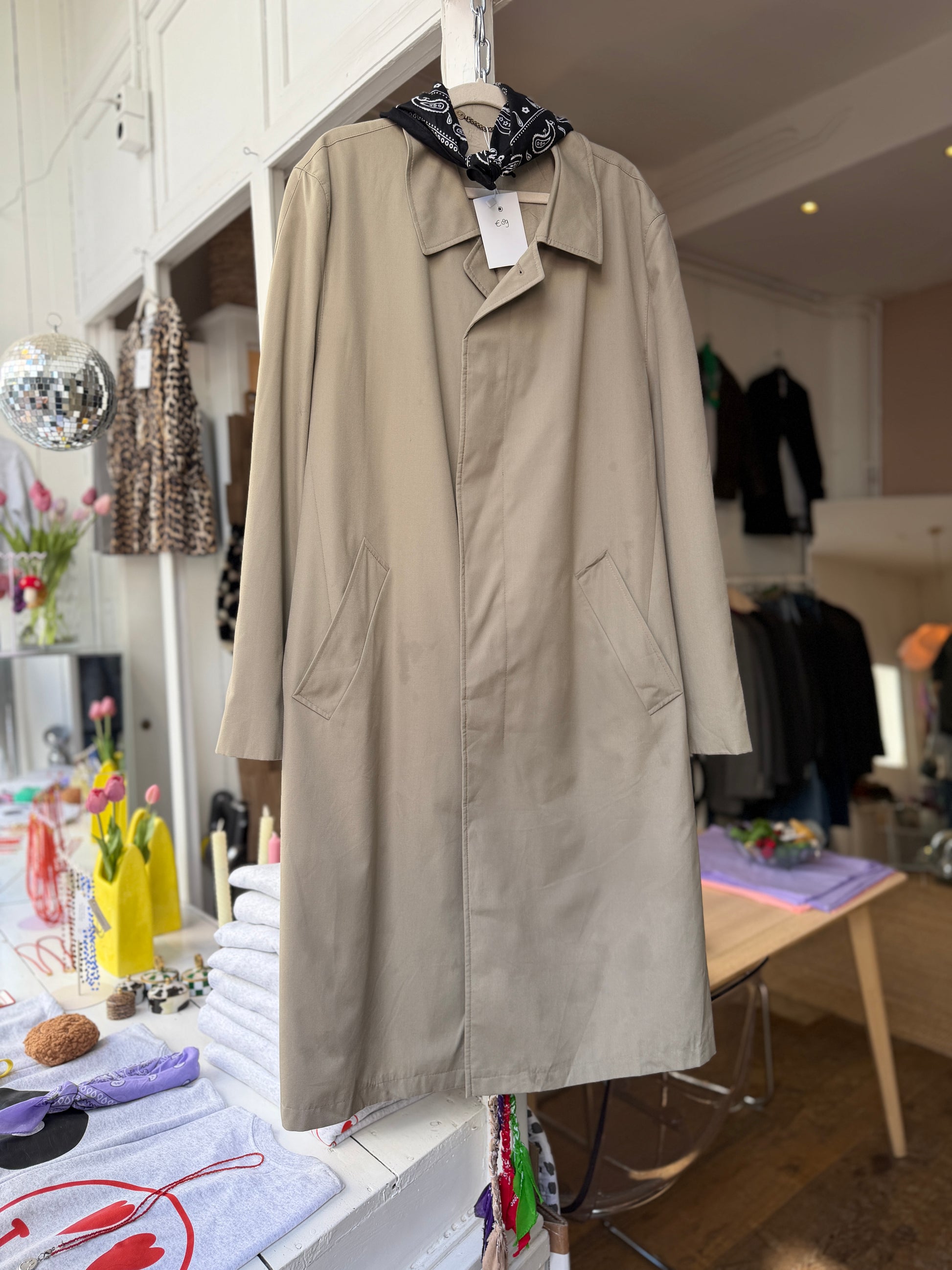 Maat L/XL - trenchcoat beige met geruite binnenkant - Kirsten is 174 en draagt normaal maat M.