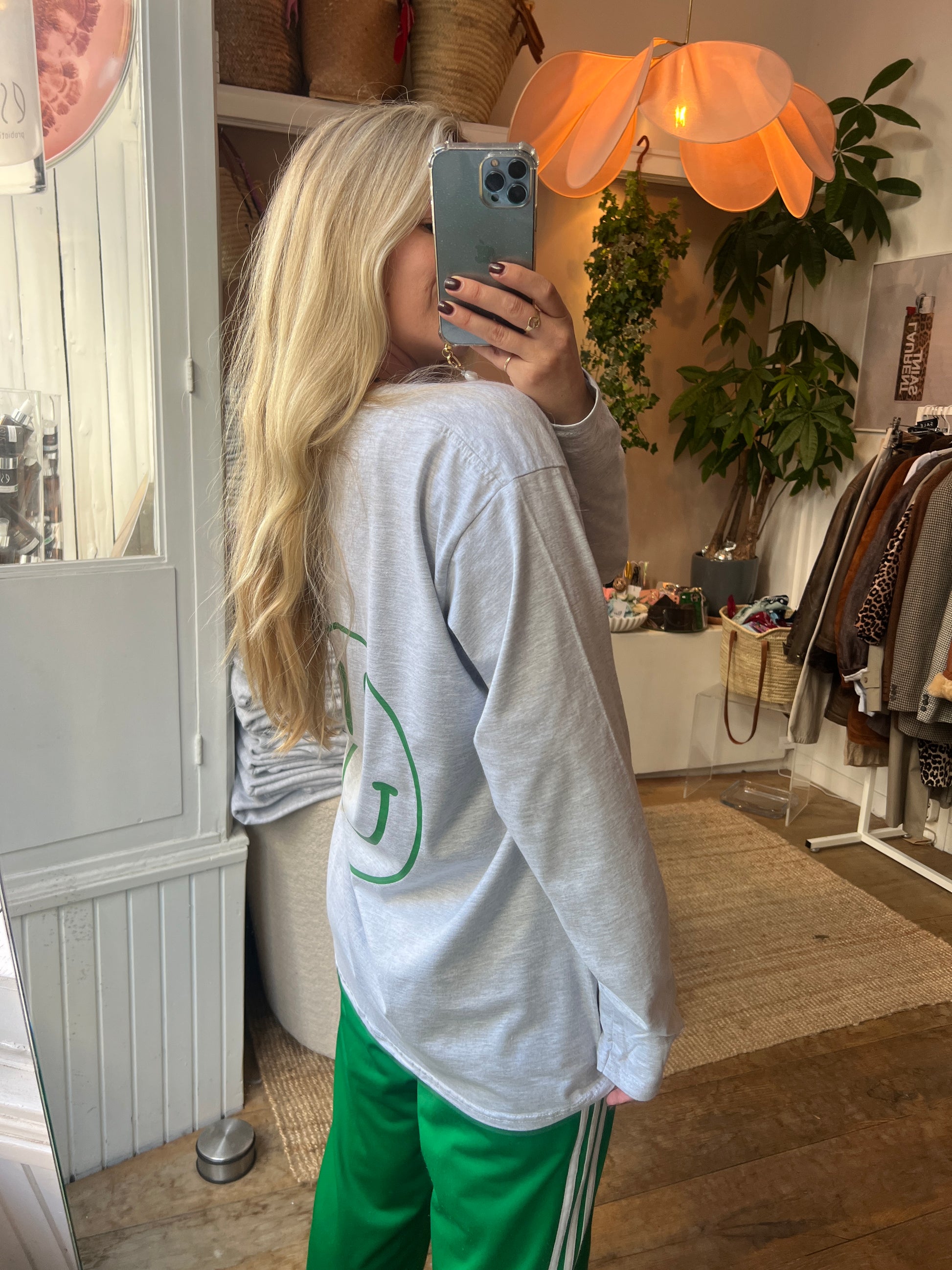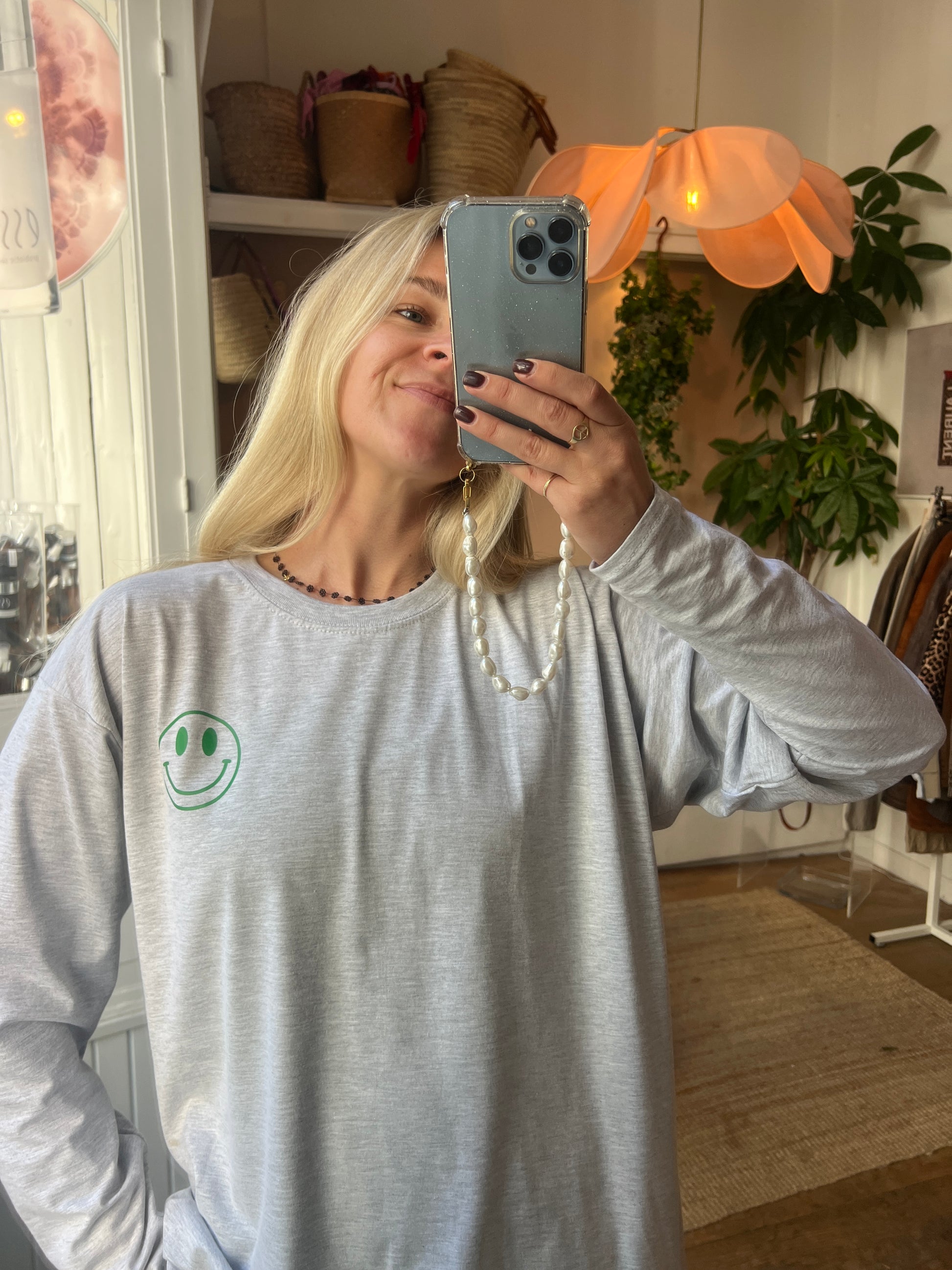 - Grijze longsleeve met aan de achterkant een smiley en aan de voorkant een kleine smiley