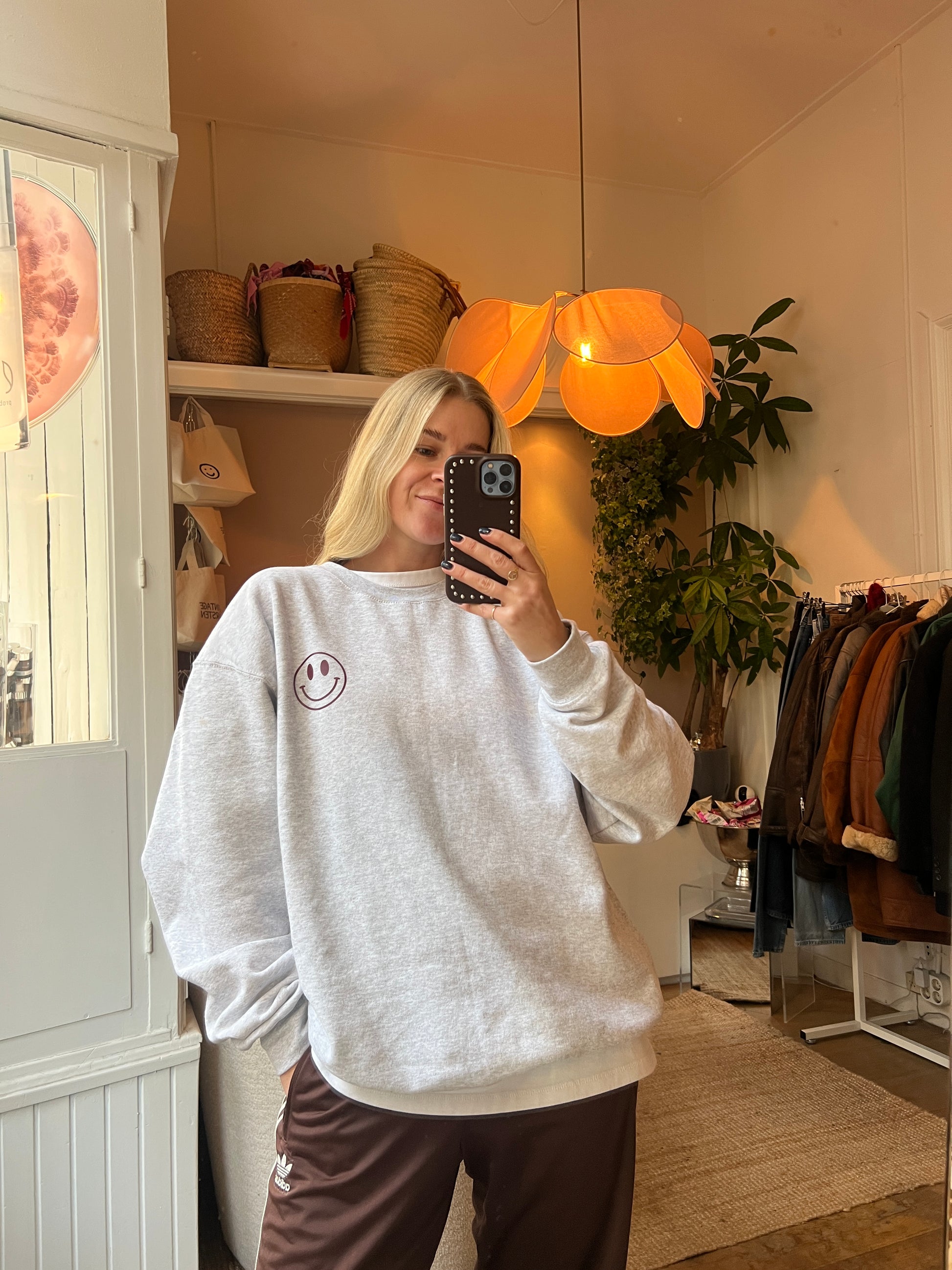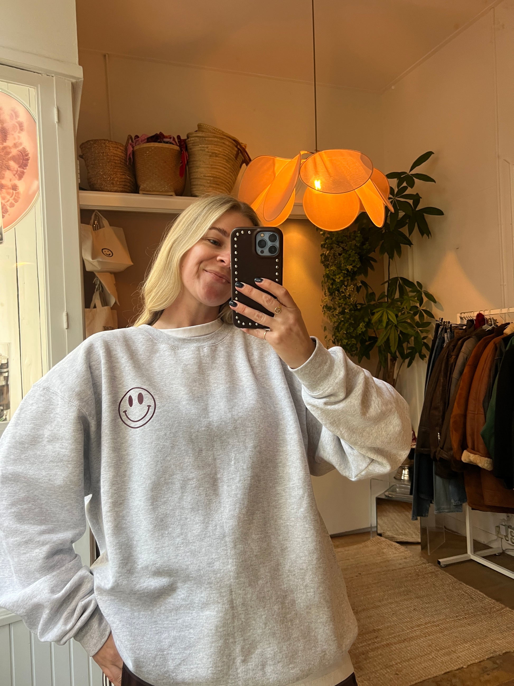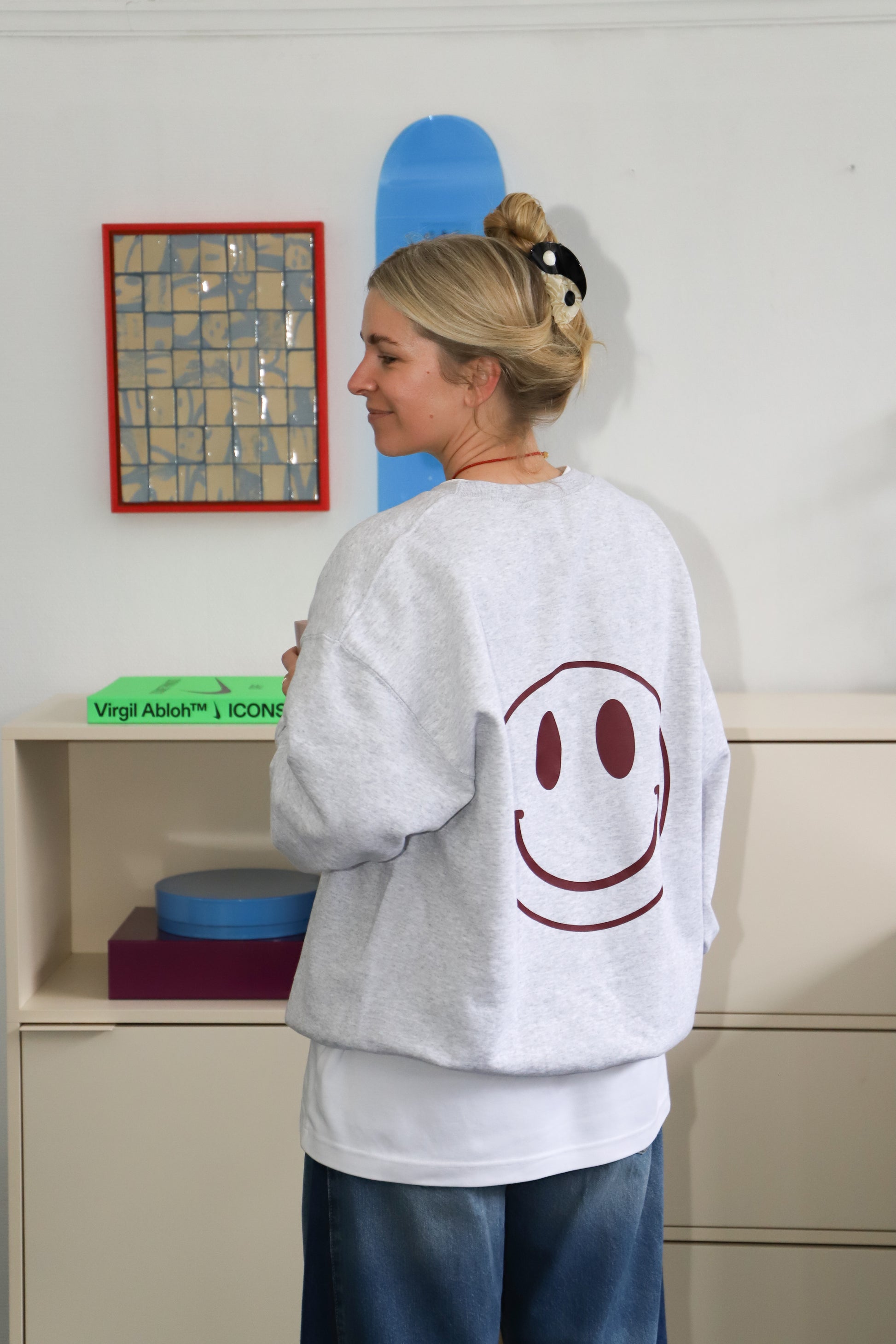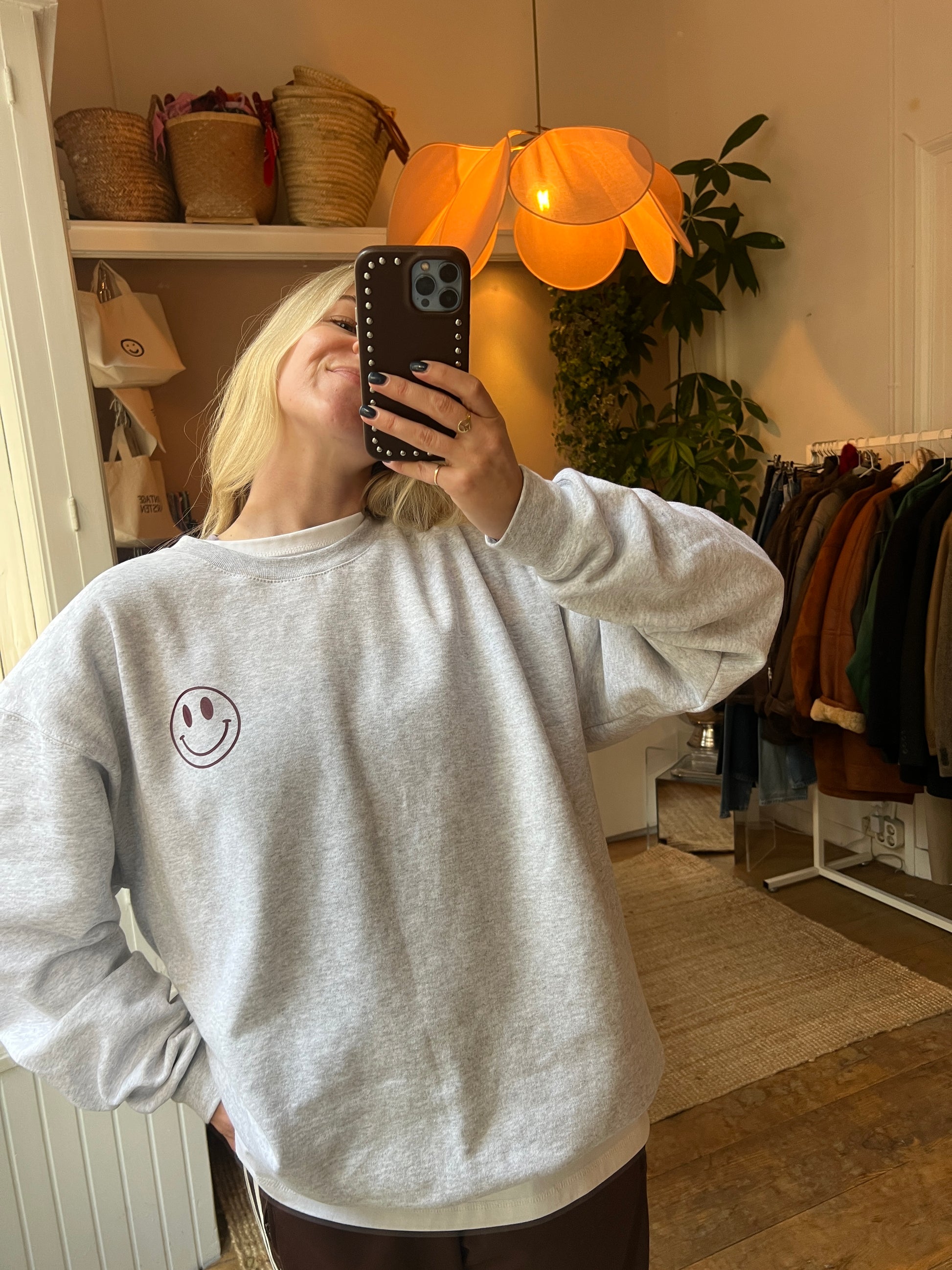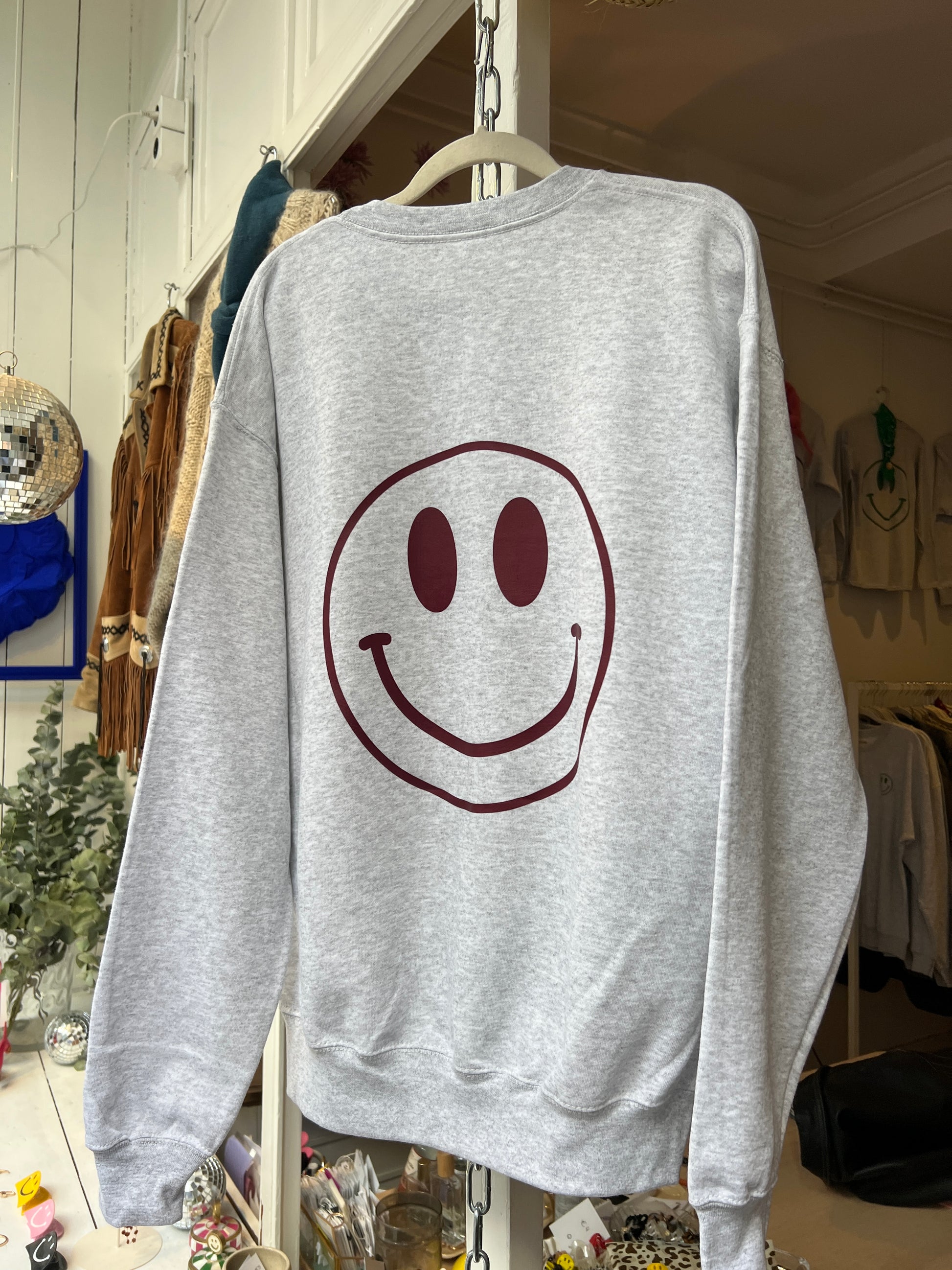 - Grijze trui met aan de achterkant een smiley en aan de voorkant een kleine smiley