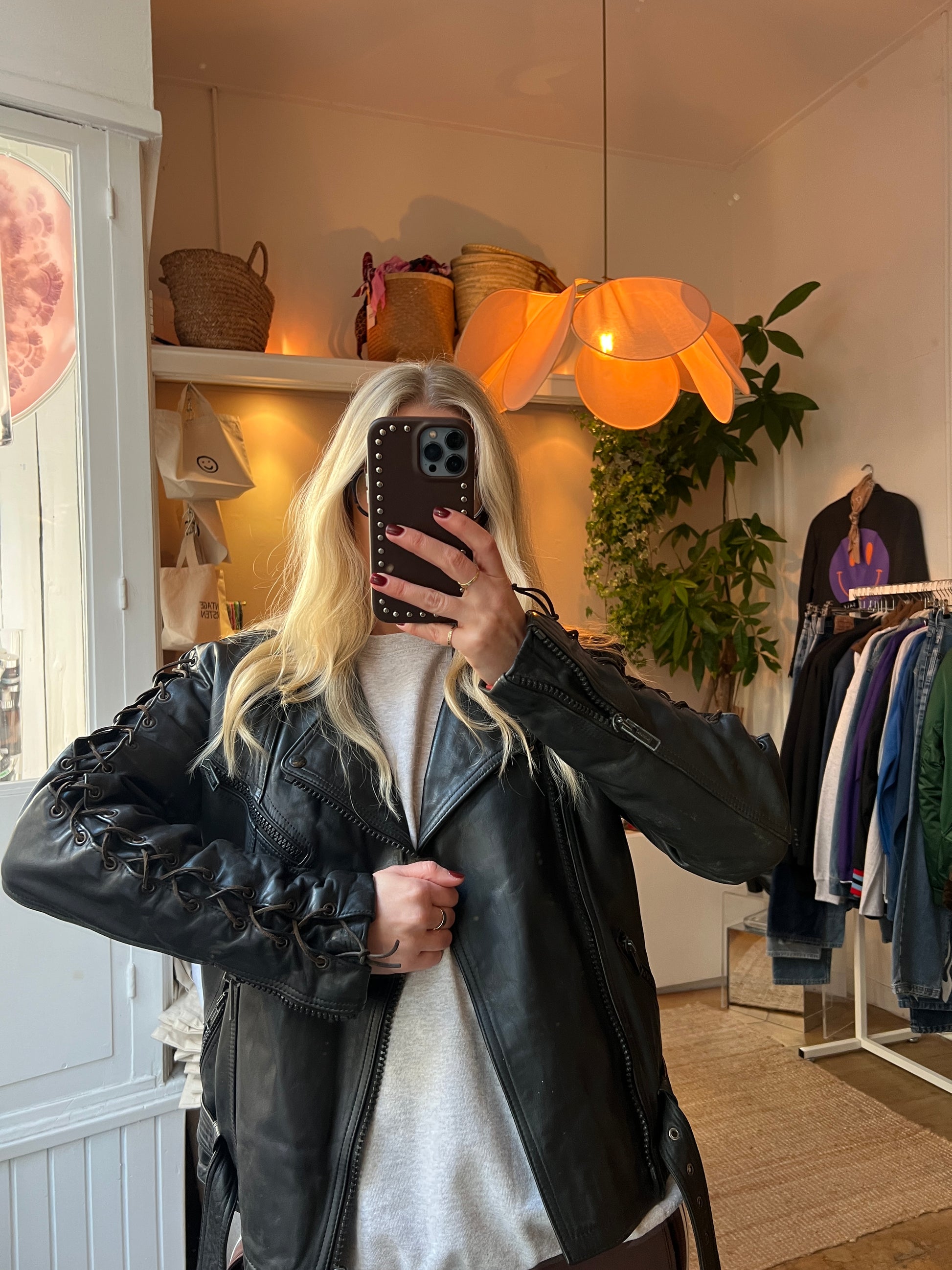 Een prachtig zwart leren bikerjack met toffe veters aan de zijkant en achterkant. Jas is een maat 50, maar valt iets kleiner dus meer en M/L ◡̈