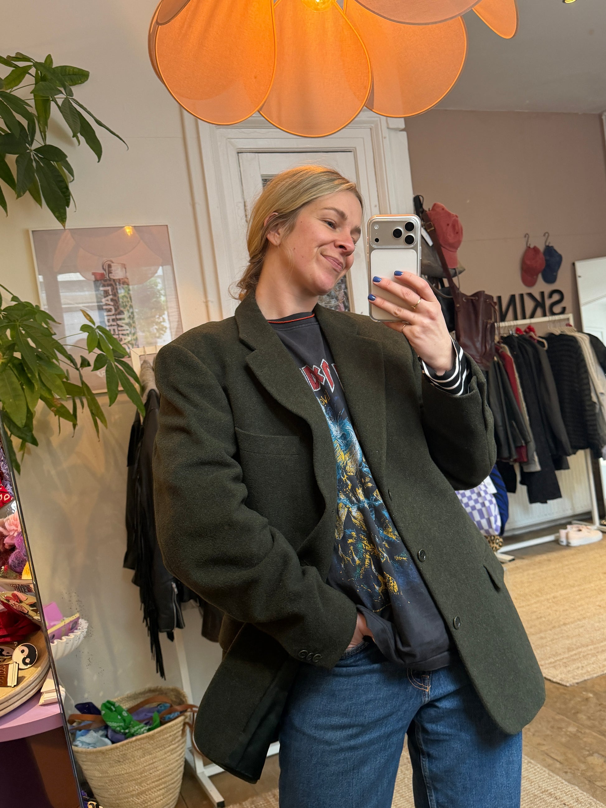 Deze oversized vintage blazer is geschikt voor maten S tot XL en kan zowel in een relaxte oversized stijl als meer aansluitend gedragen worden, voor een casual maar verzorgde look. De blazer heeft een prachtige mosgroene kleur. Het materiaal is cashmere met wol wat de blazer een unieke uitstraling geeft. Kirsten is 174 en draagt normaal maat M.